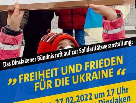 Das Bündnis Dinslaken ruft zu einer Solidaritätsveranstaltung mit der Ukraine am morgigen Sonntag, 27. Februar 2022 vor dem Rathaus auf. Reden werden die Bürgermeisterin Michaela Eislöffel und ein Vertreter der Jüdischen Gemeinde Duisburg. Ein...